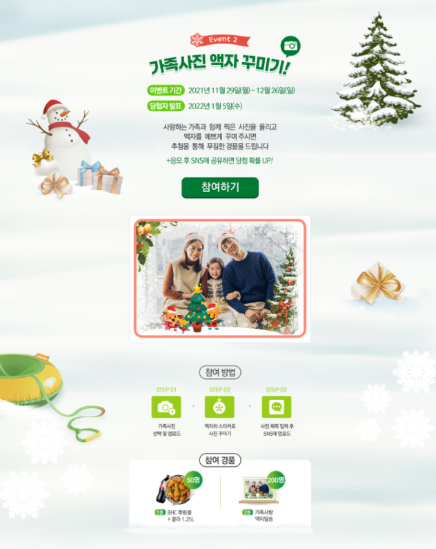 가족사진 액자 꾸미기 경품은 BHC 뿌링클 + 콜라 1.25L(50명), 가족사랑 액자발송(200명)를 추첨하여 드려요~!