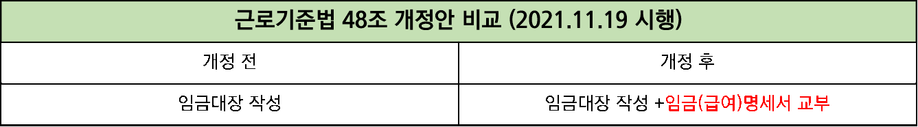 2021년 11월 19일부터 개정된 근로기준법에 따라, 사업장의 규모(5인 미만 사업장 포함), 업종, 고용형태(일용직•시간제) 와 관계없이 모든 사용자는 임금 지급 시 임금명세서를 노동자에게 지급하도록 하고 있습니다.