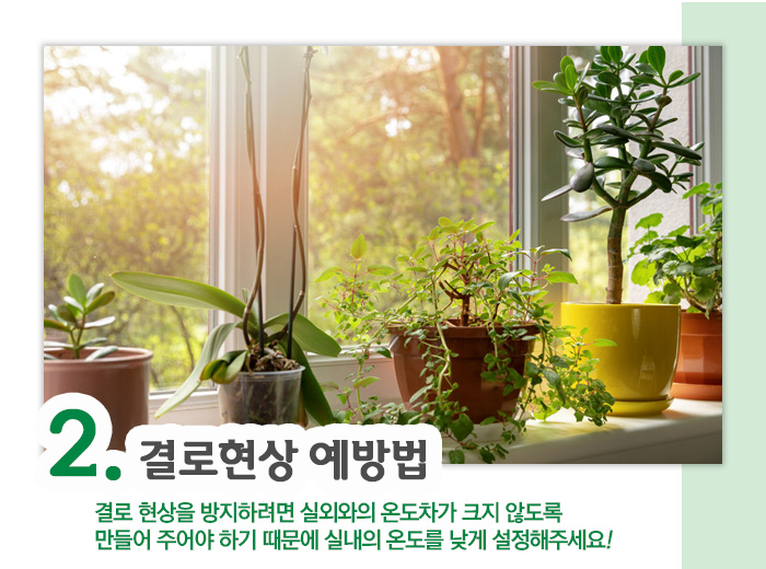 2. 만약 화분을 키우거나 가습기를 사용하는 집이 있다면 벽, 창문과의 틈을 두고 사용하셔야 습기로 인한 결로 현상을 방지할 수 있습니다.