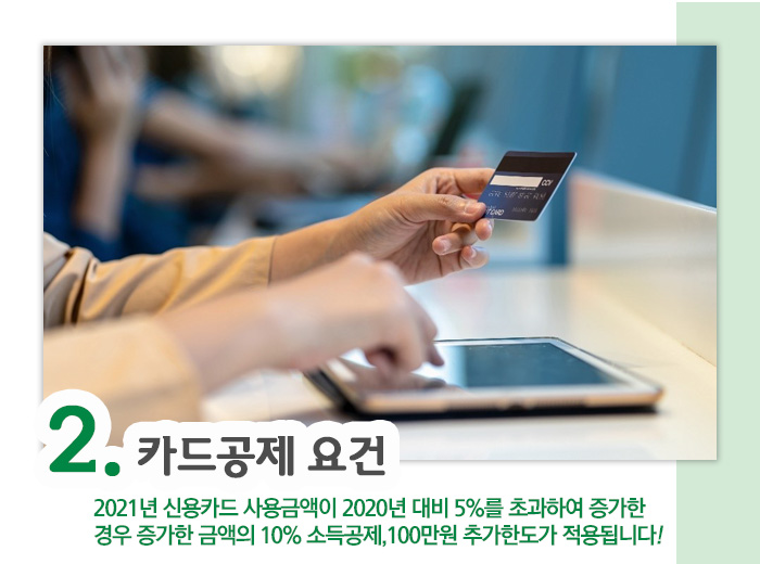 2021년 신용카드 사용금액이 2020년 대비 5%를 초과하여 증가한 경우 증가한 금액의 10% 소득공제 및 100만 원 추가 한도를 적용 받을 수 있습니다.
