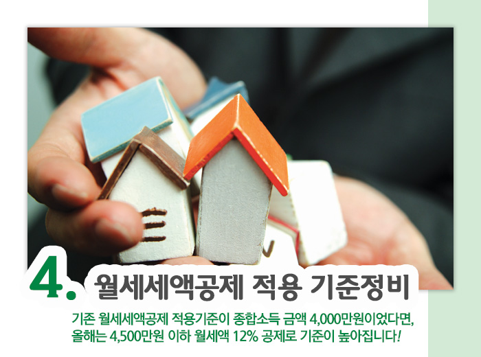 기존에는 종합소득 금액 4,000만 원 이하인 경우 월세액의 12%가 공제되었다면, 올해부터는 종합소득 금액 기준이 4,500만 원 이하로 높아진다고 합니다.