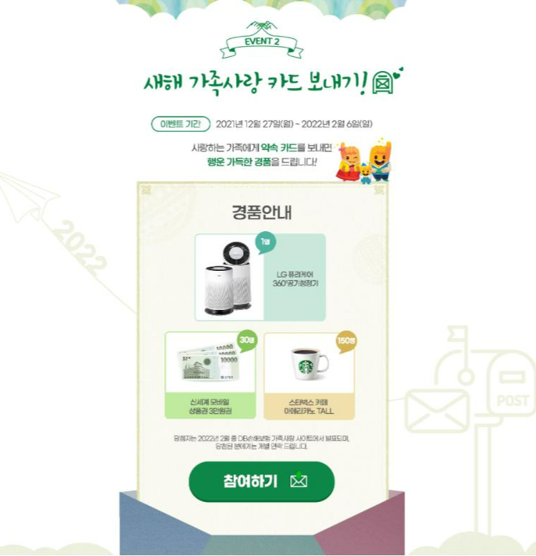 새해를 맞아 사랑하는 가족에게 약속 카드를 보내는 이벤트로, 참여하기 버튼을 누른 뒤 가족사랑 우체통에서 마음에 드는 카드 봉투와 사랑 듬뿍 담은 메시지를 적어 SNS를 통해 가족들에게 공유하시면 참여 완료입니다!