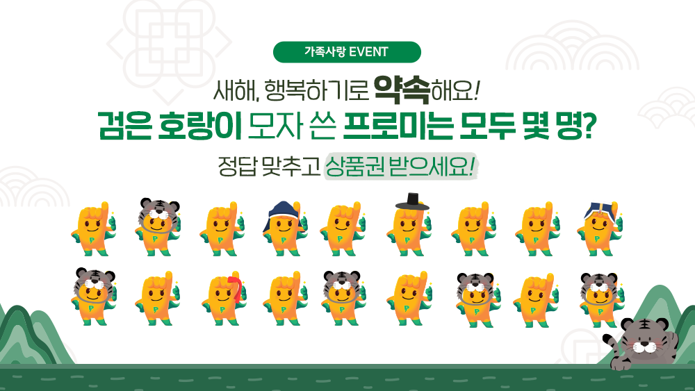 2022년 임인년을 맞아 진행되는 가족 사랑 이벤트는, ‘새해 행복하기로 약속해요! 검은 호랑이 모자 쓴 프로미를 찾는 이벤트인데요. 새해 검은 호랑이의 해를 맞아 재미있는 이벤트 참여하셔서 신세계 상품권도 받고! 새해에도 가족들과 함께 행복하게 보내보세요 ♡
