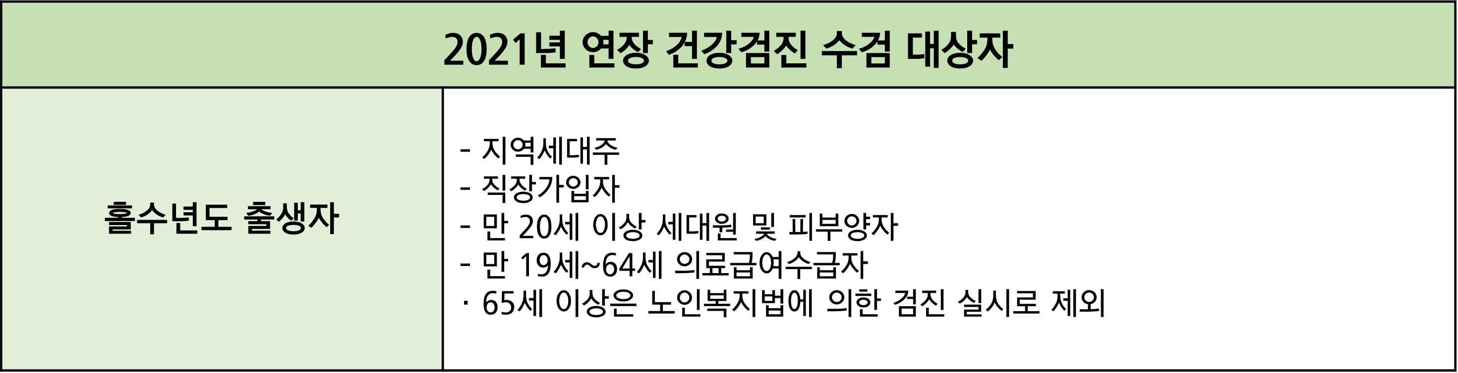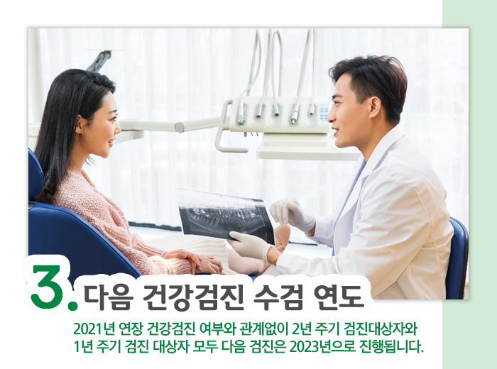 2021년 연장된 검진 수검을 받으신 분들은 연장 수검 여부와 관계없이 2년 주기 검진 대상자(지역가입자, 직장 피부양자, 의료급여 수급권자 포함하는 사무직 근로자)와 1년 주기 검진 대상자(비사무직 근로자) 모두 다음 검진 연도는 2023년으로 진행됩니다.