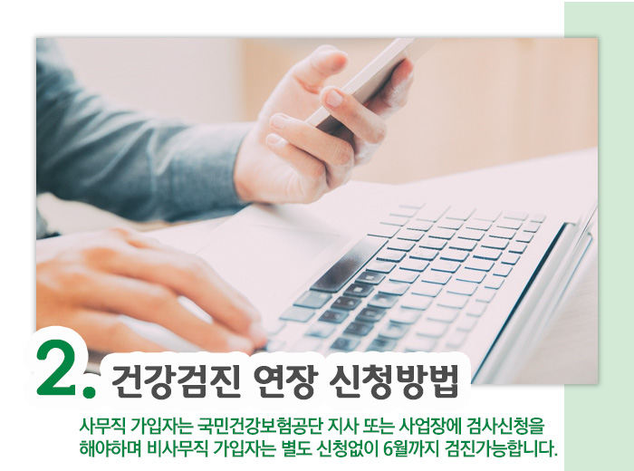 연장 기한은 2022년 6월까지이며 1년 주기 검진 대상자인 비사무직 근로자는 본인이 원하는 경우 2022년 상반기(2022.7.1이전)에 검진을 받고 추가 등록 신청을 통해 2022년 하반기에 추가 검진을 받을 수 있습니다.