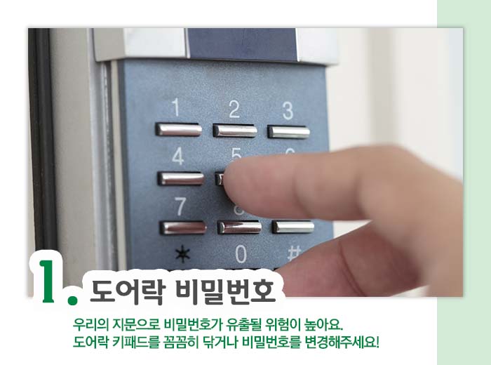 기본 중에 기본인 현관문 단속! 최근 열쇠보다는 도어락을 사용하시는 분들이 훨씬 많은데요. 매일 사용하는 도어락에는 지문이 잔뜩 묻어있다는 점 알고 계신가요? 최근 빈집털이 범죄가 도어락에 남아있는 지문으로 일어나는 경우가 빈번하게 발생한다고 합니다.