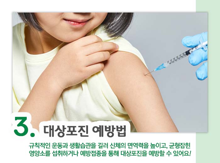또 대상포진은 백신 접종이 가능한데요. 대상포진 바이러스에 대항하는 항체를 만들어 미리 예방할 수 있다고 하는 예방접종을 하는 것도 좋은 예방법이 될 수 있겠죠?