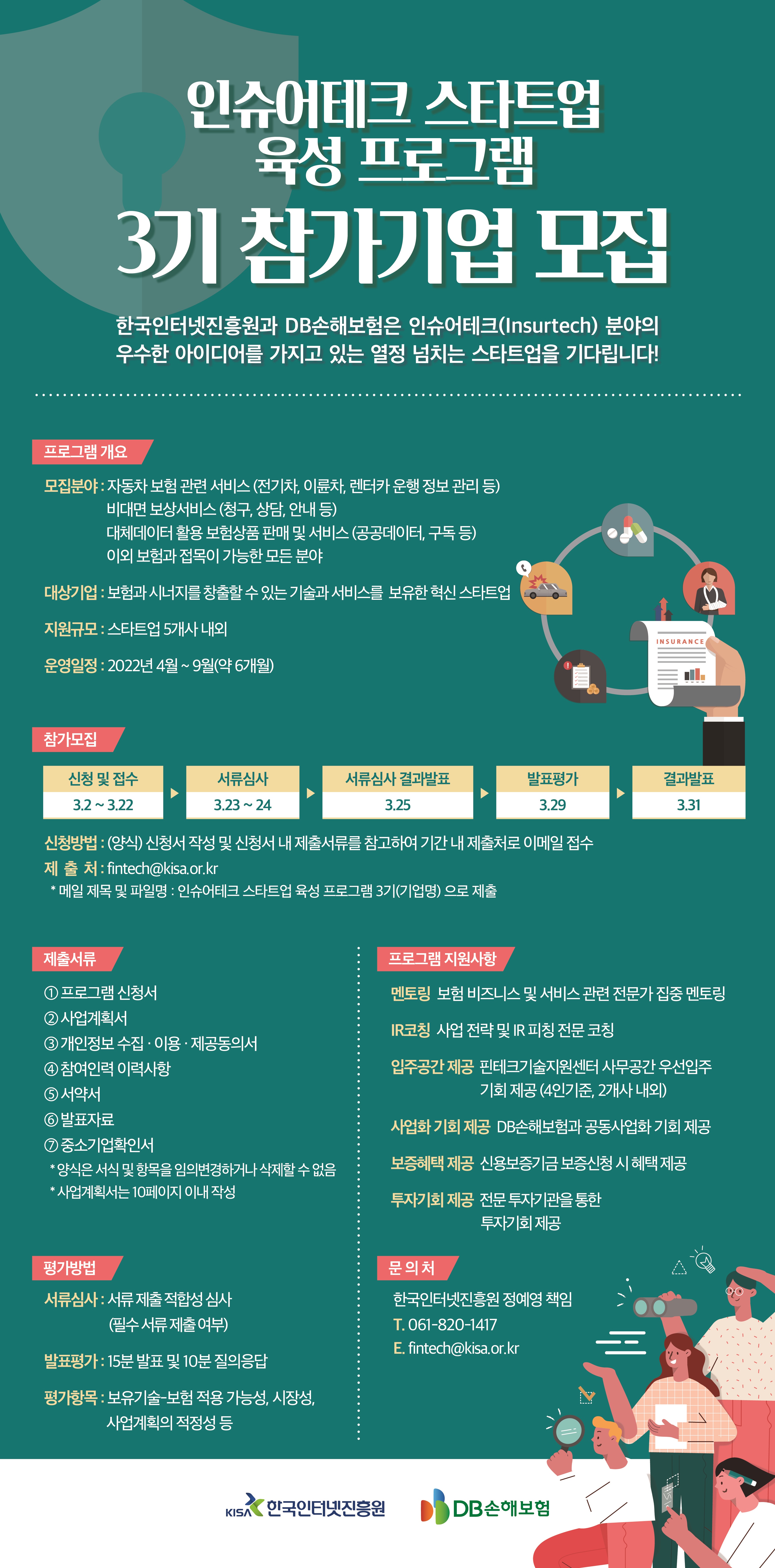 DB손해보험과 KISA는 2022년에도 보험 비즈니스에 기반을 둔 유망 스타트업을 발굴해서 지원할 예정입니다. 이번 3기에서는 전기차나 렌터카 등 자동차 관련 서비스 플랫폼, 상담이나 청구 등 비대면 보상 서비스, 대체데이터를 활용한 보험상품 판매 및 서비스를 하는 스타트업을 모집하며, 이외에도 보험과 접목이 가능한 혁신적인 기술과 서비스를 가진 스타트업은 누구나 지원이 가능합니다.