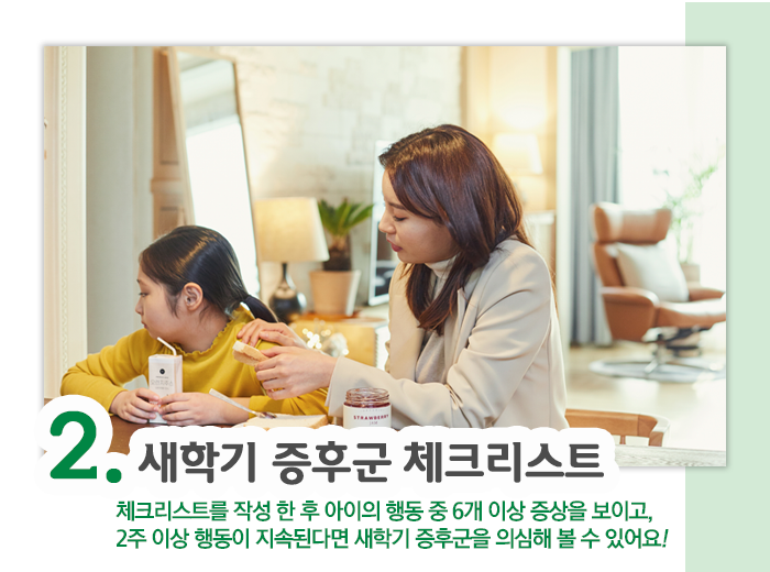 최근 아이들의 행동을 잘 생각해 보시고 체크해 보세요! 아래의 체크리스트 중 6개 이상의 증상을 보이고, 이런 증상이 2주 이상 지속된다면 새 학기 증후군을 의심해 볼 수 있어요.