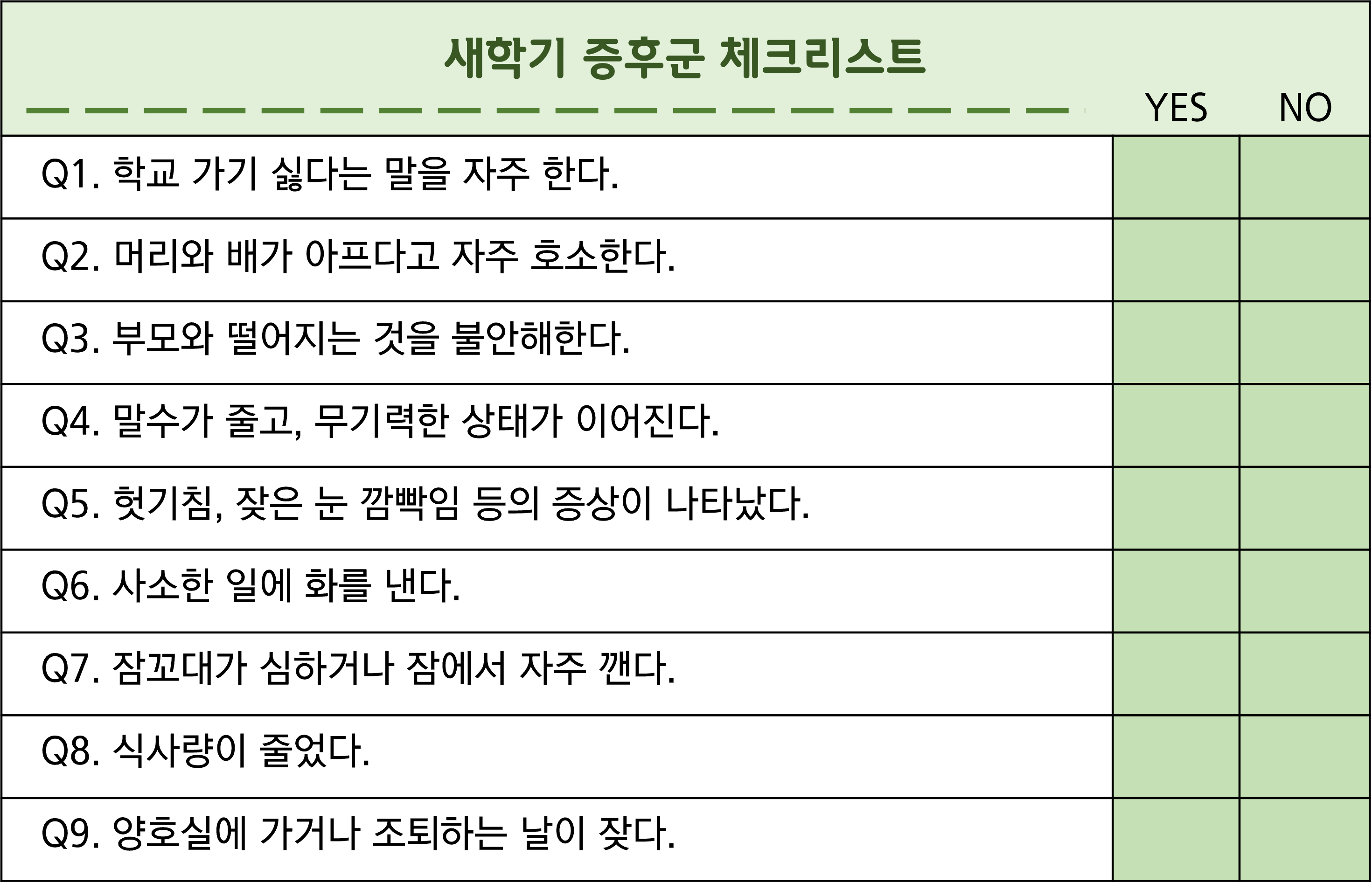 최근 아이들의 행동을 잘 생각해 보시고 체크해 보세요! 아래의 체크리스트 중 6개 이상의 증상을 보이고, 이런 증상이 2주 이상 지속된다면 새 학기 증후군을 의심해 볼 수 있어요.