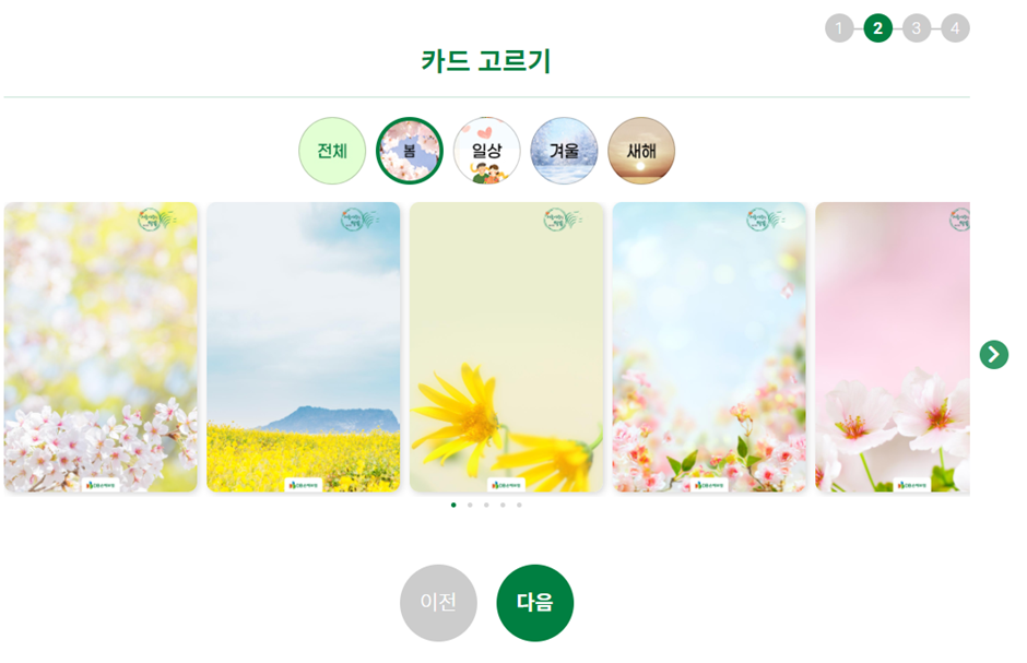 다양한 카드 디자인 중 마음에 드는 카드를 하나 선택하고 메시지를 적어주세요!