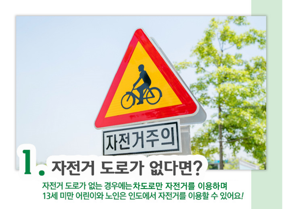 만약 우측이 버스전용차로인 경우에는 이 도로를 제외한 가장 오른쪽 차로를 이용해야 하며 13세 미만 어린이와 노인은 인도에서 자전거를 탈 수 있다고 하니 이 점 참고해 주세요!