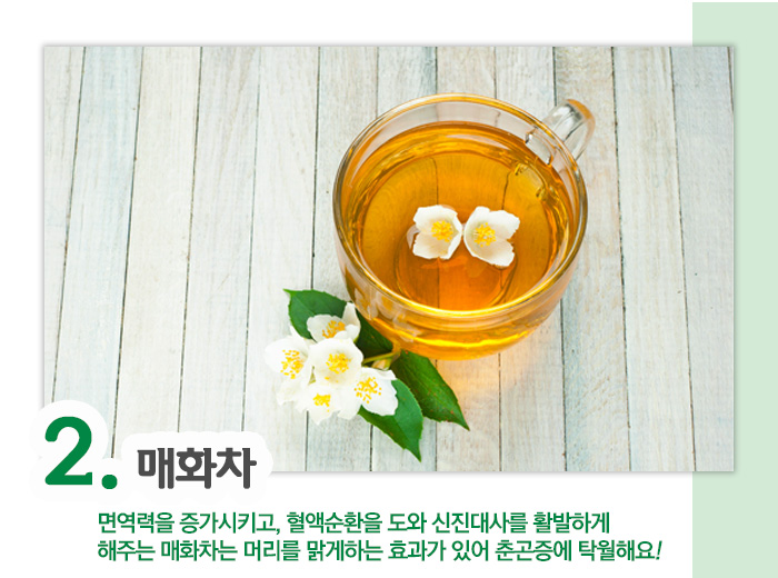 매화꽃차는 향기가 좋고, 면역력을 높여주며 혈액순환을 도와 신진대사를 활발하게 해주어 춘곤증에 탁월한데요. 머리를 맑게 해 집중력을 높여 줍니다.