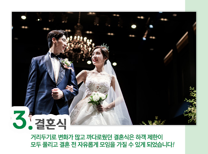 코로나 시기 하객 50명부터 299명까지 변화가 유난히 많고, 엄격했던 결혼식 하객 인원 제한이었는데요. 최대 299명 규모로만 가능했던 결혼식도 인원 제한 없이 할 수 있게 되었습니다.