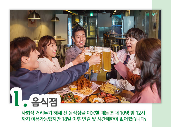 이전까지 식당과 카페, 술집 같은 음식점을 이용할 때는 사적 모임 최대 10명으로 밤 12시까지만 이용 가능했는데요. 18일 이후로는 인원 제한이 없고, 시간제한도 없어졌습니다.