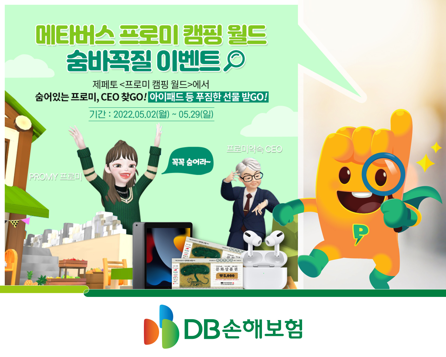 DB손해보험은 가정의 달을 맞아 메타버스 제페토(ZEPETO)내 프로미 캠핑월드에서 ‘숨바꼭질’이벤트를 오는 29일까지 진행합니다.