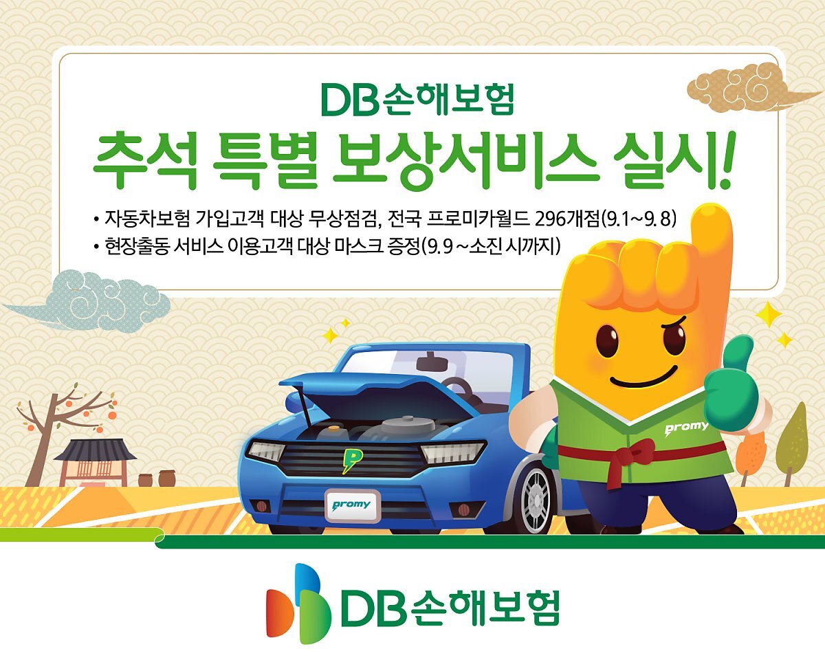 DB손해보험(대표 김정남)은 민족의 대명절 추석을 맞이하여 고객의 안전하고 편안한 귀성길을 위해 전국 프로미카 월드점에서 차량무상점검서비스를 실시하고 현장출동 서비스 이용 고객을 대상으로 방역마스크를 제공한다고 29일 밝혔다.