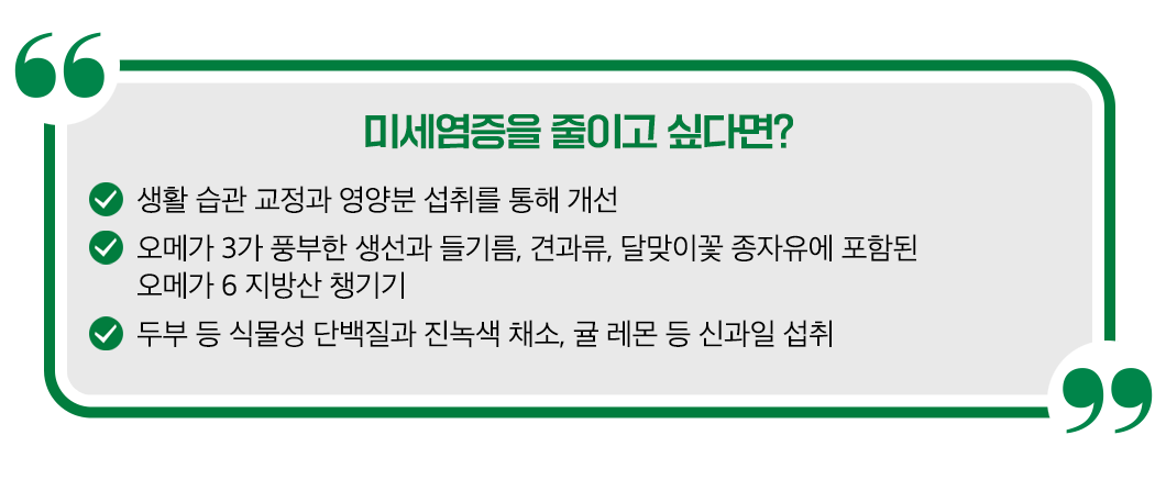 즉, 미세염증은 노화되면서 생기는 퇴행성 질환의 큰 원인이 됩니다. 일반적인 염증은 병원에서 처방하는 항생제, 소염제 등의 약으로 치료하지만 미세염증은 생활 습관 교정과 영양분 섭취를 통해 개선시킬 수 있습니다. 미세염증을 줄여주는 오메가 3가 풍부한 생선과 들기름, 견과류를 잘 챙겨 먹고, 달맞이꽃 종자유에 포함된 오메가 6지방산도 챙겨야 합니다. 그리고 주요 혈관질환의 위험인자인 호모시스테인을 줄여주는 두부 등 식물성 단백질과 진녹색 채소, 귤 레몬 등 신과일을 섭취하는 것이 도움이 됩니다.