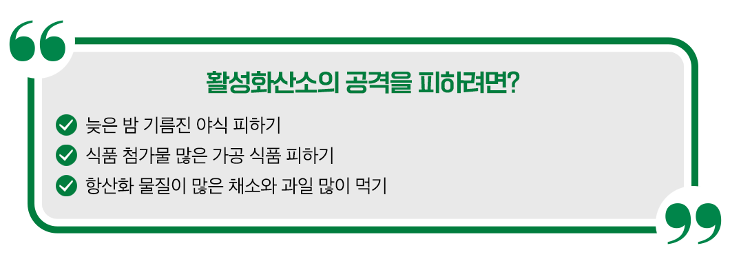 예를 들어 늦은 밤 기름진 야식을 먹고 바로 자는 경우, 신체가 필요 이상의 열량을 보충해 그 부산물까지 많아집니다. 혹은 식품 첨가물이 많은 가공 식품의 섭취, 수많은 전자기기에서 나오는 전자파, 공해나 환경 호르몬, 정신적 스트레스 또한 활성 산소 발생의 원인이 됩니다. 이러한 활성산소는 미토콘드리아가 제 기능을 못하게 해 에너지를 만들지 못하고 부산물 즉 활성산소를 더 증가시키는 악순환을 만들게 됩니다. 이렇게 손상된 미토콘드리아가 많아지는 것이 바로 ‘노화’입니다.