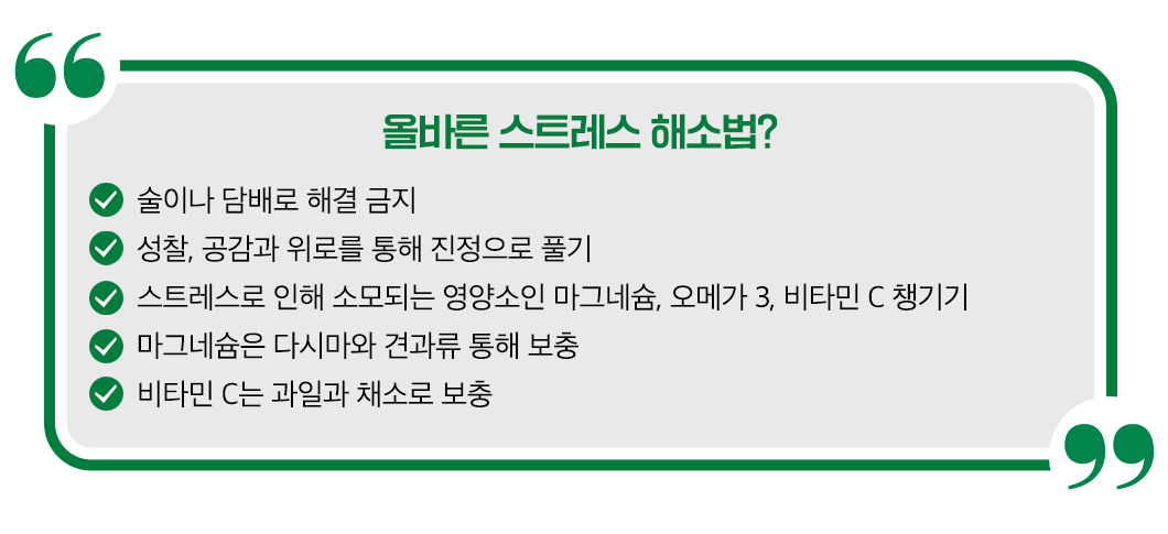 스트레스를 술이나 담배로 잠깐 잊는 것보다는 성찰, 공감과 위로를 통해 진정으로 푸는 것이 중요합니다. 스트레스로 인해 주로 소모되는 영양소는 마그네슘, 오메가 3, 비타민 C 등입니다. 마그네슘은 다시마와 견과류를 통해 보충할 수 있고 비타민 C는 많은 과일과 채소로 보충할 수 있습니다. 무엇보다 좋은 생각과 긍정적인 생각은 건강한 몸과 마음에 가장 중요하고 장수 유전자인 ‘텔로미어’를 보호합니다.