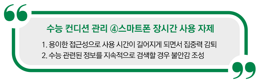 사용자가 원하는 정보와 기능을 손쉽게 제공해주는 스마트폰의 기능은 자극적인 콘텐츠를 쉽게 접할 수 있도록 도와주는 매개체가 되기도 하는데요. 이러한 콘텐츠들을 스트레스 해소 방안으로 장시간 시청하게 되면, 자칫 뇌의 쾌락 중추를 과도하게 자극하여 오히려 집중력을 방해하는 요인이 될 수 있습니다. 또한, 수능에 대한 불안감 때문에 수능 관련 기사, 정보 등을 지속적으로 검색하는 것도 오히려 수험생들에게 불안감을 더욱 조성하는 역효과가 나타날 수 있으니, 최대한 2023 수능 전까지 스마트폰을 장시간 사용하지 않도록 주의가 필요하겠습니다.