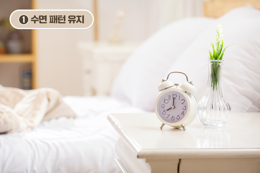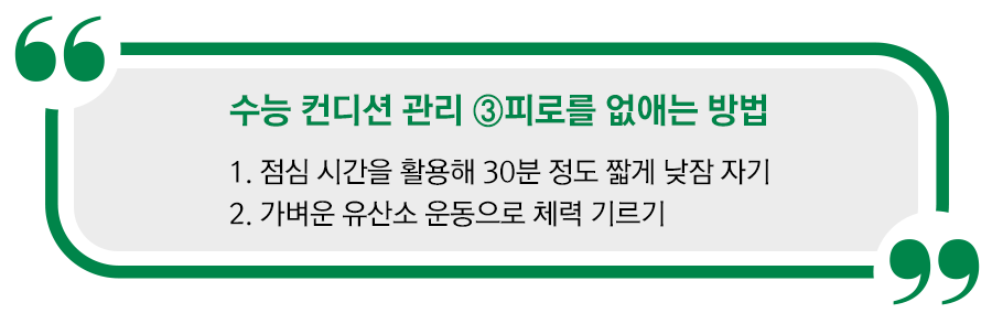 잠을 잘 자냐, 잘 못 자냐에 따라 컨디션 난조를 불러일으킬 수 있기 때문에 수능이 얼마 남지 않은 수험생들에게 지금부터라도 적정 수면시간을 꼭 지키라고 말해 주세요! 오후 11시 취침, 오전 6시 30분에 기상해 최소 7시간 이상 충분히 자야 합니다. 그래야 기억력이 증가하고 수능 1교시 시작 시각인 8시 40분엔 뇌파가 완전히 깨 높은 집중력으로 시험을 치를 수 있답니다.
