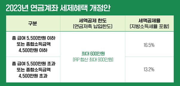 이처럼 연금상품에는 다른 곳에는 없는 많은 세제혜택을 주고 있는데, 내년부터는 더 확대될 전망입니다. 기획재정부가 2022년 세제개편안을 통해 2023년 1월 1일부터 연금계좌에 납입하는 금액에 대한 세액공제 한도를 900만원(연금저축은 600만원)까지 늘리기로 했기 때문입니다. 2022년까지는 종합소득 1억원(총 급여 1.2억원)을 넘는 자의 연금저축 세액공제 한도가 300만원으로 그 이하의 자보다 100만원이 적었으나, 2023년 납입분부터는 소득액 구분없이 모두 600만원을 적용받게 됩니다. 세액공제율은 현재와 동일하게 16.5%와 13.2%가 적용됩니다. 연금계좌로부터 연금을 수령하는 경우에는 1,200만원을 넘는 연금액에 대해 종합과세하던 것을 종합과세 또는 15% 분리과세 중 선택할 수 있도록 함으로써 세부담을 조금이나마 덜게 되었어요.