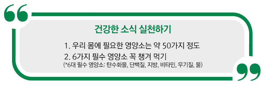 건강을 오랫동안 유지하기 위해선 폭식과 편식은 금물! 6대 영양소를 고루 챙긴 식단으로 건강한 소식 함께 도전해 봐요!