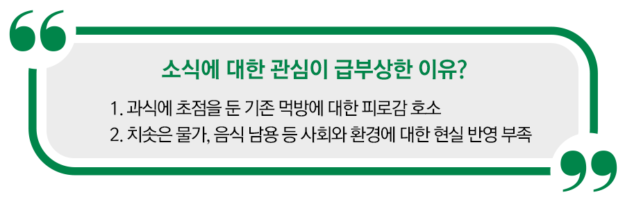 최근 먹방계를 덮친 소식좌 열풍! 많이 들어보셨죠? 이전엔 생소할 수 있었던 소식 먹방이 이젠 하나의 장르가 되어 TV와 SNS를 점유하였습니다. 사실 소식 먹방이 급부상한 시기는 불과 1년 남짓하다고 해요. 그런데 이렇게 짧은 시간에 소식 먹방의 인기가 급격하게 많아진 이유는 무엇일까요?