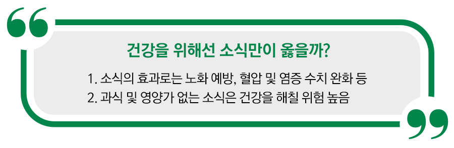 그렇다고 해서 권장 칼로리를 초과해서 먹는다면, 살이 급격히 찌게 되고 고혈압, 당뇨 등과 같은 합병증 발병률이 높아질 수 있습니다. 최근 다이어트 방법으로 유명해진 간헐적 단식도 마찬가지인데요. 간헐적 단식은 오랜 시간 공복 후 허기진 배에 음식을 급하게 채워 넣어야 하므로 잘못된 식습관이 생길 위험이 높고, 충분한 영양소를 섭취하기 어려울 수 있죠. 따라서 무조건 적게 먹는 소식좌도 NO! 오랜 시간 굶고 한 번에 많이 먹는 간헐적 과식도 NO! 적당량을 영양가 있게 먹는 ‘건강한 소식’이 가장 바람직합니다.
