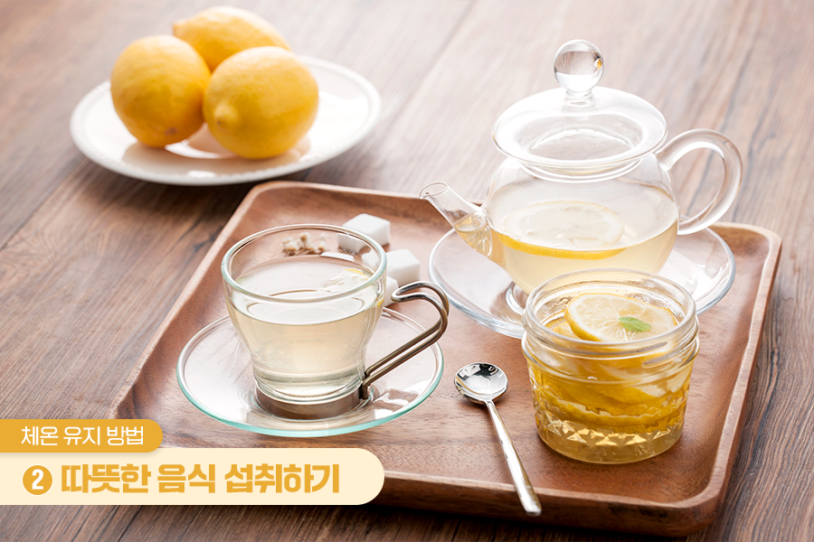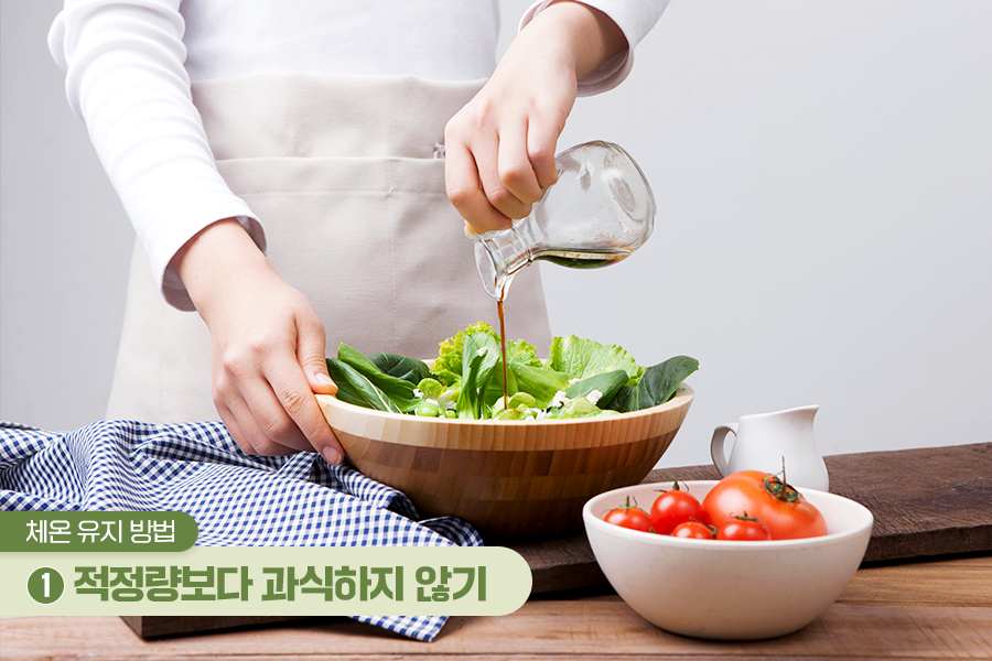 적정 체온을 유지하기 위해선 먼저 과식하지 않는 것입니다. 과식은 비만의 원인, 소화불량 장애 등 건강에 좋지 않은 영향을 끼칠 수 있죠. 하지만 체온에도 영향을 미칠 수 있다는 사실, 알고 계셨나요? 과식을 하게 되면 우리 몸의 혈액이 소화를 위해 위장으로 몰리게 되면서 다른 부분의 혈액이 적어집니다. 그럼 전체적으로 체온이 하락해 이전보다 추위를 더 많이 느낄 수 있죠. 때문에 과식보단 적절한 식사량과 함께 비타민이 풍부한 채소 및 과일류도 드시길 바랄게요.