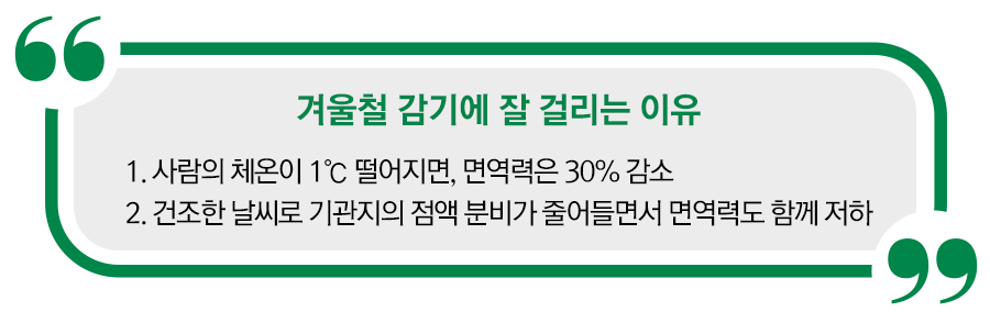 추운 겨울이 되면 감기 조심하라는 말 많이 들어보셨을 거예요. 날씨와 감기에는 어떤 상관관계가 있길래 그러는 걸까요? 연구 결과, 사람의 체온은 평균 36.5℃로, 여기서 1℃만 낮아져도 면역력이 30%나 떨어진다고 합니다. 반대로 적정 체온을 유지한다면 면역력이 5배나 높아진다고 해요. 또한, 감기 바이러스 중 하나인 리노 바이러스는 체온보다 낮은 온도인 33~35℃에서 증식 속도가 빠르기 때문에 체온이 떨어지는 겨울철이 되면 감기에 잘 걸리는 거죠.