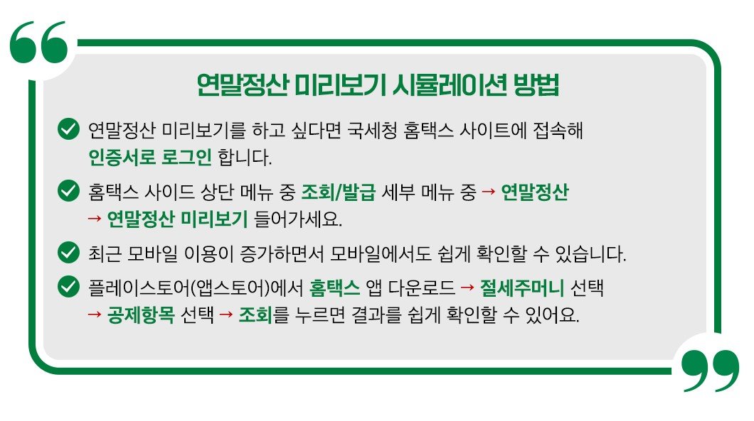 국세청은 직장인들이 꼼꼼하게 연말정산 준비할 수 있도록 ‘연말정산 미리보기 서비스’를 홈택스를 통해 제공하고 있습니다.