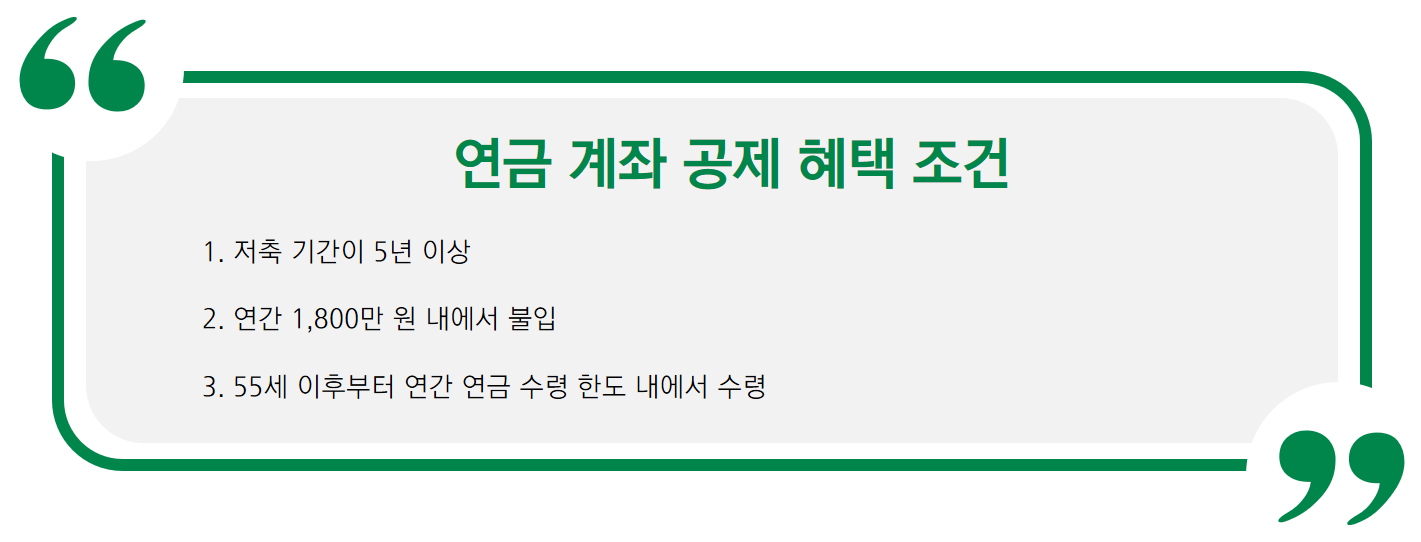 연금 계좌 세액 공제는 근로자 및 사업자가 스스로 노후 생활을 대비할 수 있도록 국가가 세제 지원을 하는 제도입니다. 소득세법상의 연금소득 원천인 연금 저축 계좌와 퇴직 연금 계좌에 납입된 금액에 대해 400만 원을 한도로 세액 공제합니다. 다만 이러한 공제 혜택을 받기 위해서는 다음의 요건을 충족해야 합니다.