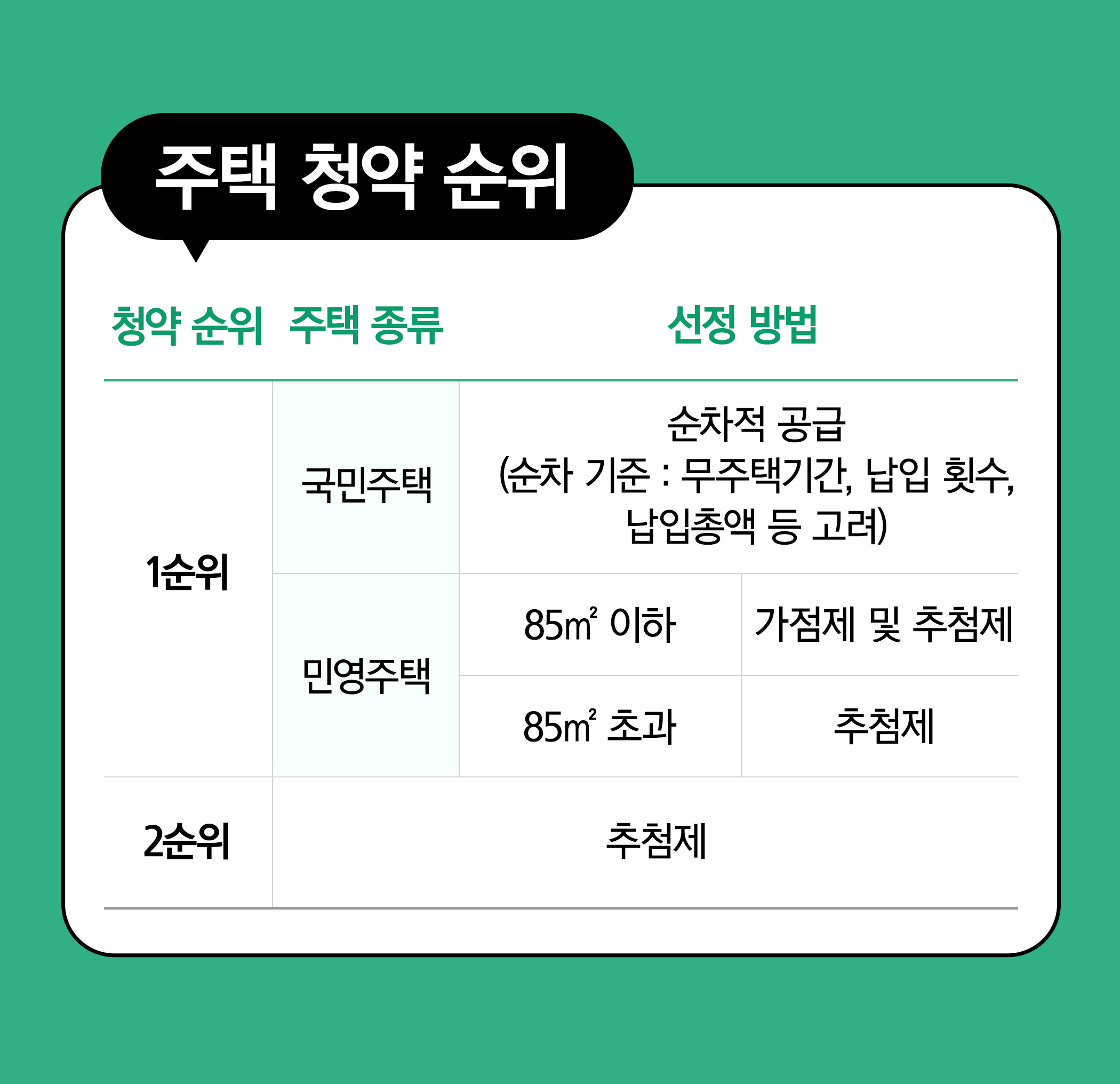 가점제는 점수를 매겨 높은 점수로 당첨자를 가리는 것이고, 추첨제는 무작위 추첨을 통해 당첨자를 선정하는 것입니다. 청약가점제는 민영주택 청약 시 동일 순위 내에서 경쟁할 때 우선권을 부여하는 기준입니다. 무주택기간(최대 32점), 부양가족 수(최대 35점), 청약통장 가입 기간(최대 17점)에 따라 가점을 받아 최대 84점을 기준으로 높은 점수부터 청약 당첨의 기회를 얻을 수 있습니다.