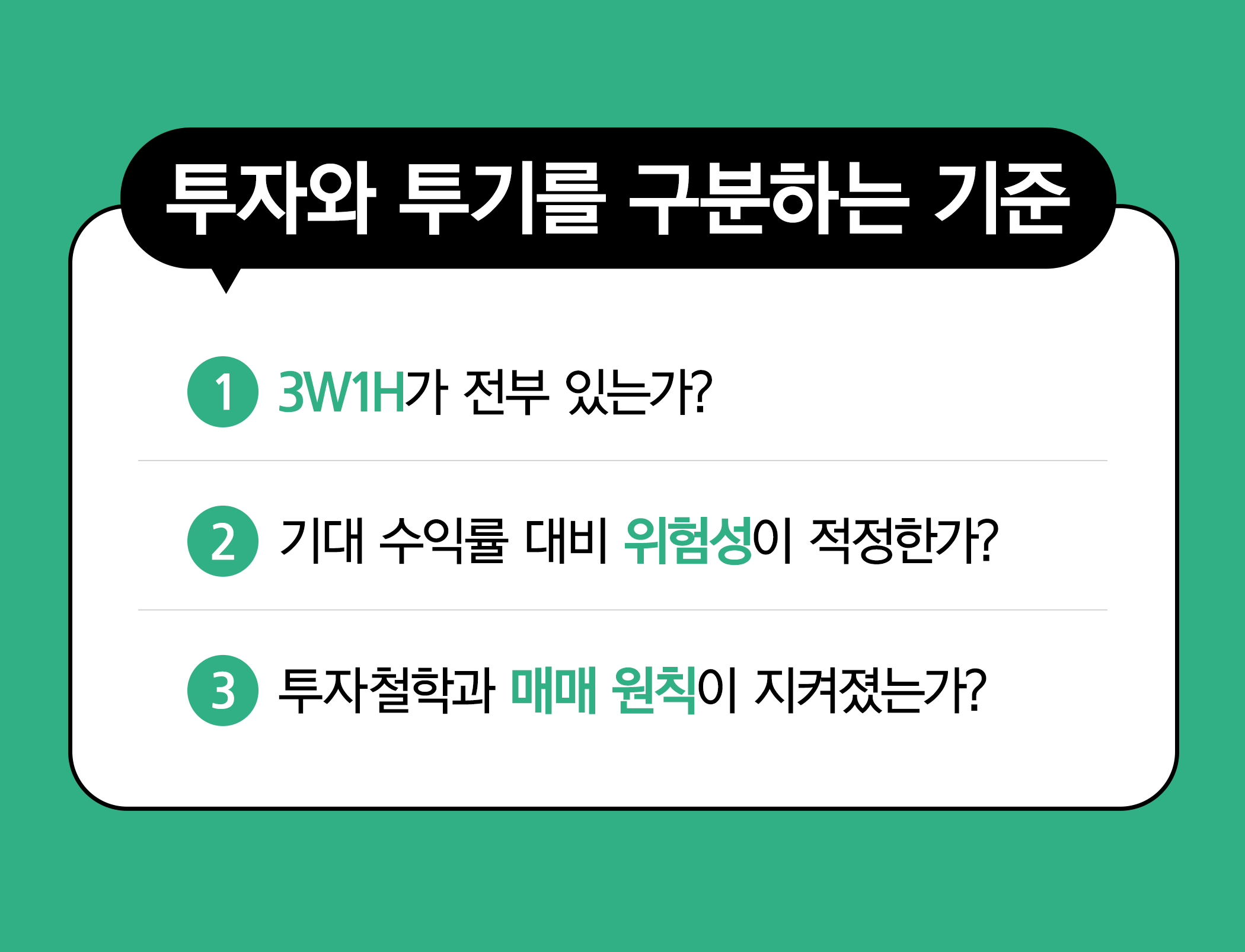 성공적인 투자를 하기 위해서는 3W1H과정을 거쳐야 합니다. 주어진 정보를 취합하고(What), 분석하는데 어떤 방법(How)이 왜(Why) 가장 적절한지 알아야 합니다. 그리고 이를 통해 분석한 결과값을 통해 투자를 할 것인지에 대한 결론(What)을 내려야 합니다.