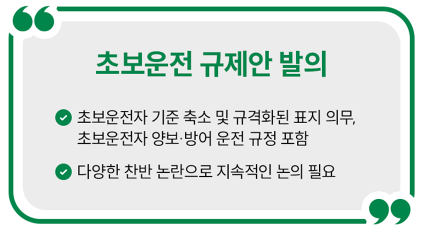 보다 더 안전하고, 질서 정연한 교통문화를 만들기 위해선 초보운전 스티커 규격화가 필요하다는 입장인데요. 실제로 조사에 따르면, 미국 뉴저지에선 임시면허 기간 중 초보운전 표지 부착을 의무화하자 자동차 사고율이 9.5%나 감소할 정도로 큰 효과를 보았다고 해요. 다양한 근거가 뒷받침되어 발의한 초보운전 스티커 규제! 과연 승인될 수 있을까요?