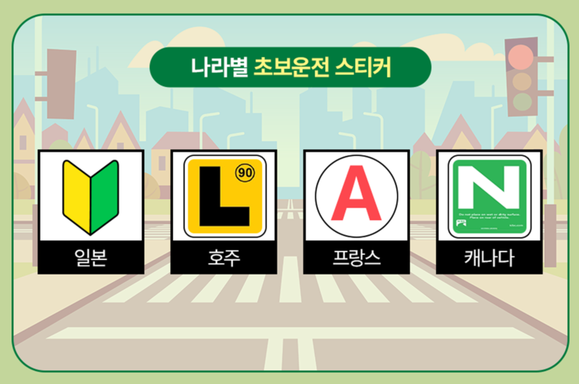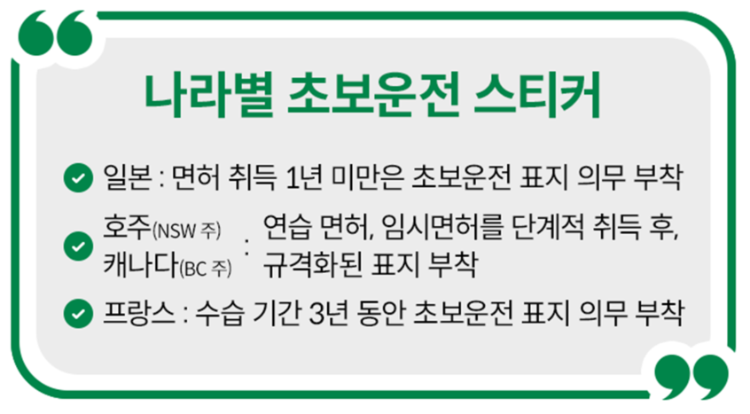 몇몇 해외의 경우, 초보운전 스티커를 규격화하여 시행 중에 있습니다. 일본은 면허 취득 1년 미만인 자에게 초보운전 표지를 의무적으로 부착하여, 위반 시 2만엔 이하의 벌금을 처하도록 규정하였고요. 호주 NSW주와 캐나다 BC주는 정식면허를 취득하기 전 연습 면허, 임시면허를 단계적으로 취득하여 규격화된 표지를 부착하도록 했죠. 프랑스는 면허 취득 후 3년은 수습 기간으로, 그동안엔 차에 규격화된 초보운전 스티커를 부착해 운행해야 하며 이를 어길 시 35유로의 2급 고정 벌금형에 처하게 되어 있답니다.