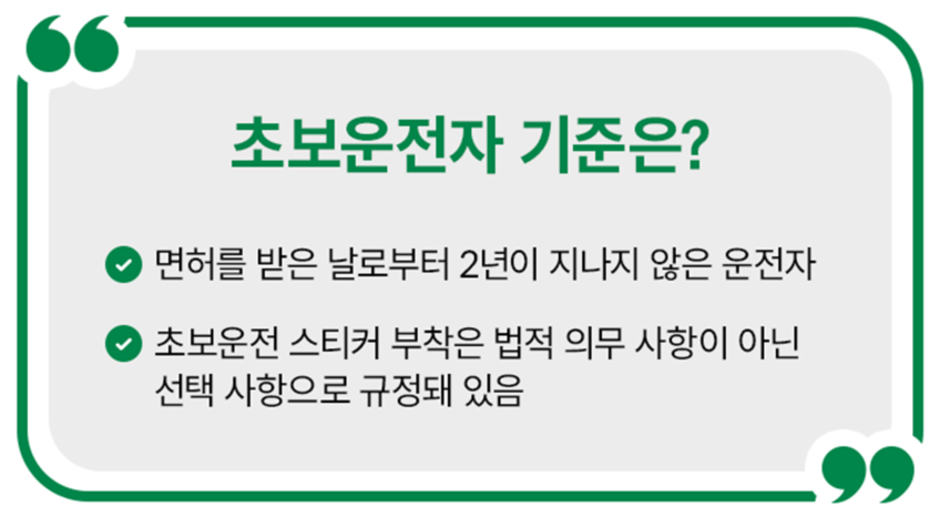 우리나라에서 초보운전자 기준은 면허를 받은 날로부터 2년이 지나지 않은 사람을 말합니다.(※도로교통법 제1장 제2조) 초보운전자가 운행하는 자동차에 초보운전 스티커를 부착하는 건 법적으로 의무사항은 아닙니다. 하지만 다른 운전자의 양보와 배려를 구하고 사고 예방의 효과를 위해 대부분의 사람이 초보운전 스티커를 부착하여 운행하는데요.
