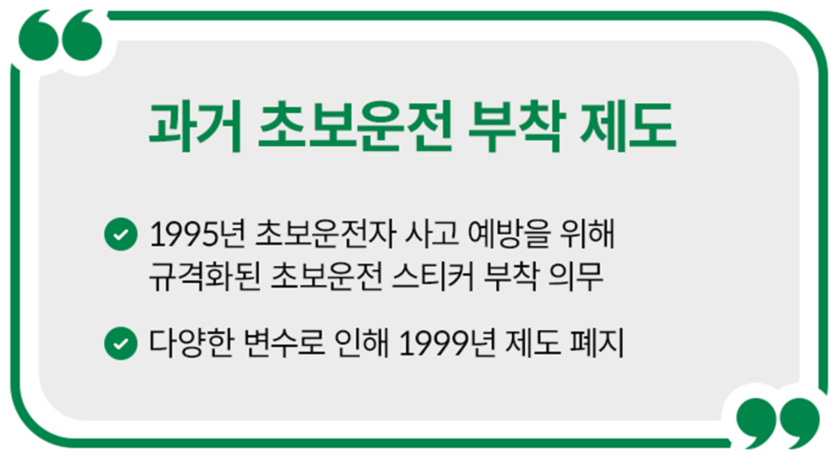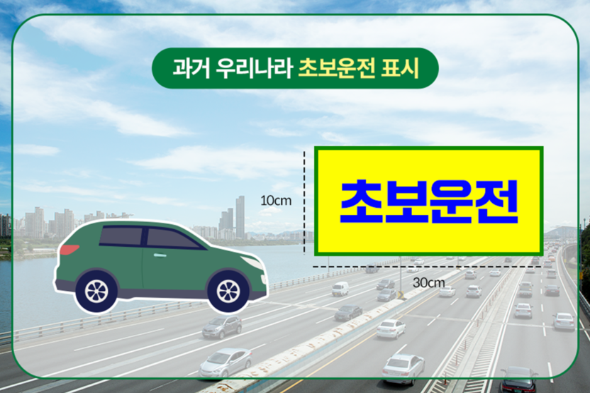 지금으로부터 28년 전인 1995년에 우리나라에도 규격화된 초보운전 스티커가 존재했다는 사실 알고 계셨나요? 1995년 초보운전 스티커 규격화 제도를 발의한 이유는 타 운전자에게 초보운전자라는 사실을 주지시켜 사고에 대비할 수 있도록 하기 위해서였습니다. 가로 30cm, 세로 10cm 크기로, 바탕 색깔은 노란색, 글씨는 청색, 테두리 선은 녹색으로 하여 초보운전 표시 스티커를 제작하였습니다.