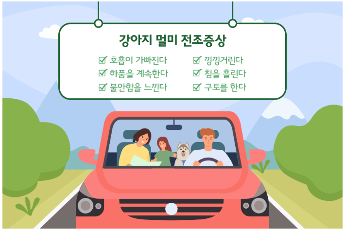 먼저 불안감을 느끼며 안절부절못하거나 낑낑거리는 행동이 지속된다면 멀미가 시작되었다는 증거입니다. 또, 계속 하품을 하거나 흘러내릴 정도의 침을 흘리는 것도 해당하고요. 구토 증상도 멀미 증상 중 하나죠.