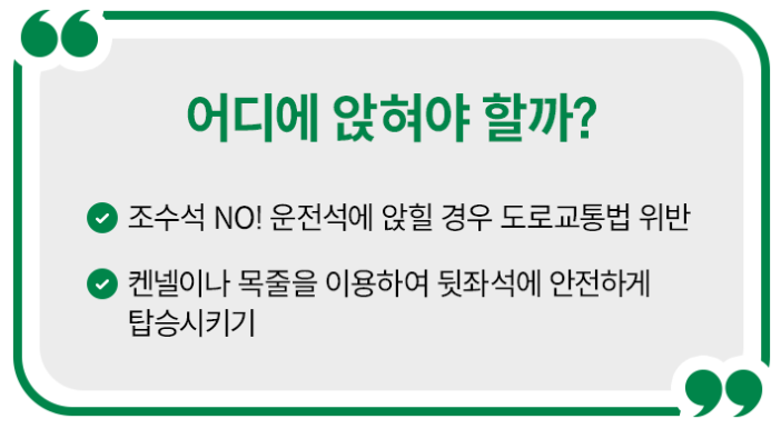 한 가지 더! 간혹 반려견을 안고 운전하는 분도 종종 볼 수 있는데요. 이는 명백히 도로교통법 위반에 해당한다는 사실! *도로교통법 제39조에 따라, 운전자가 동물을 안고 운전 시 20만 원 이하의 벌금이나 구류 또는 과료에 처할 수 있습니다.