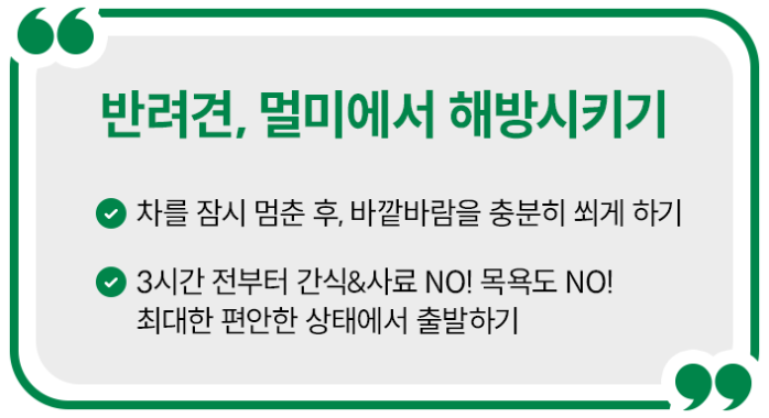 멀미를 예방하기 위해선 출발하기 최소 3시간 전엔 간식이나 사료를 주지 않는 것이 좋습니다. 공복인 상태에서 차를 타야 멀미를 예방할 수 있죠. 또한, 출발 당일에 목욕하는 것도 최대한 삼가세요! 강아지들에게 목욕은 스트레스의 원인이 될 수 있으므로, 전날 깨끗이 씻겨 주길 바랍니다. 즐거운 드라이브가 되기 위해 반려견을 최대한 편안한 마음으로 만들어 주세요☺