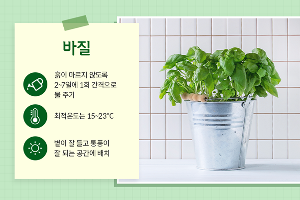 바질은 햇빛이 풍부한 환경에서 잘 자라는 양지 식물에 속합니다. 이런 이유로 집 안에서 기를 때는 볕이 잘 들고 통풍이 잘되는 베란다에서 관리하길 추천하죠. 만약 집 주방에 창문이 있고, 햇빛도 잘 든다면 주방에서 키워봐도 좋을 것 같죠? 요리에 필요할 때 바로 따서 쓸 수 있을 테니까요! 물은 2~7일에 1회 간격으로 주고, 흙이 마르기 전에 듬뿍 급수하는 것이 가장 좋답니다.