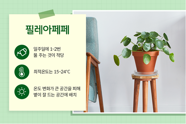 필레아페페도 앞서 소개한 식물들과 마찬가지로 15~24℃의 따뜻한 환경에서 잘 자라요. 급격한 온도 변화와 추위에 약한 편이라 베란다처럼 온도 변화가 큰 공간은 피해야 합니다.