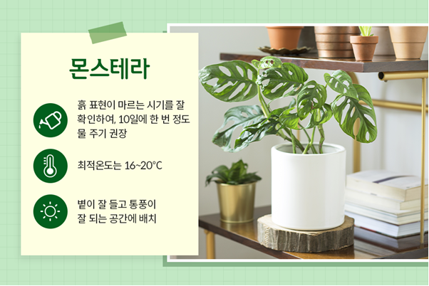 온도는 16℃에서 20℃ 사이가 적당한데요. 몬스테라는 추위에 약한 편으로 8℃ 이하에서는 저온 피해를 입을 수 있어요. 이 때문에 겨울철에는 베란다보다는 실내에서 키우는 것을 추천한답니다.