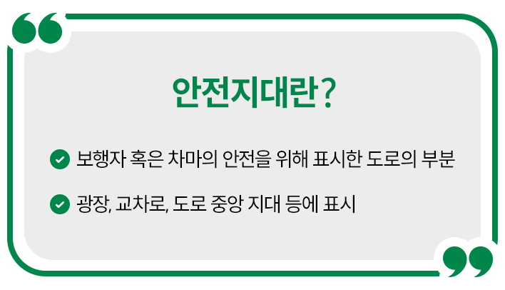 안전지대란 도로교통법 제2조 14항에 따르면, 도로를 횡단하는 보행자나 통행하는 차마의 안전을 위하여 안전표지나 이와 비슷한 인공구조물로 표시한 도로의 부분을 말합니다. 즉, 통행하는 보행자 혹은 주행하는 자동차의 안전을 위해 빗금으로 그려진 공간입니다. ‘도로 위 안전한 공간’이라고 말할 수 있겠네요.
