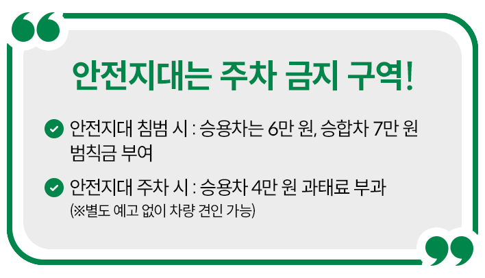 잠시 가까운 카페, 편의점에 갈 때 안전지대에 주차하고 가시는 분들 종종 있으실 거예요. 가장 안전하게 주차할 수 있는 장소이기 때문인데요. 하지만 안전지대 주차는 엄연한 불법입니다! 침범만으로도 범칙금이 부여되는데요. 안전지대 침범 시 승합차는 7만 원, 승용차는 6만 원, 이륜자동차는 4만 원이 부과됩니다.