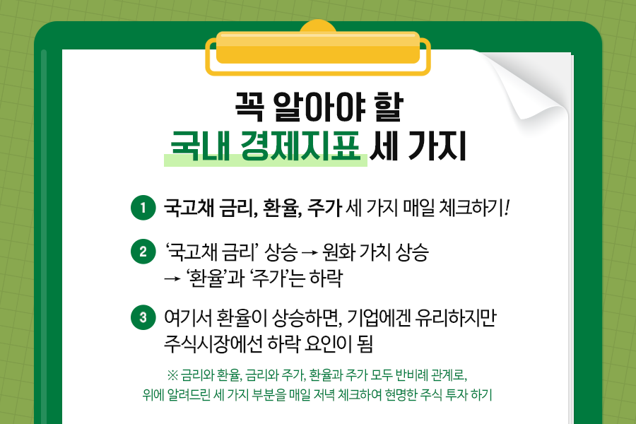 국내 경제지표 세 가지부터 말씀드리자면, 금리, 환율, 주가입니다. 투자에 관심이 있는 분들이라면 매일 위 세 가지를 확인하실 거예요.