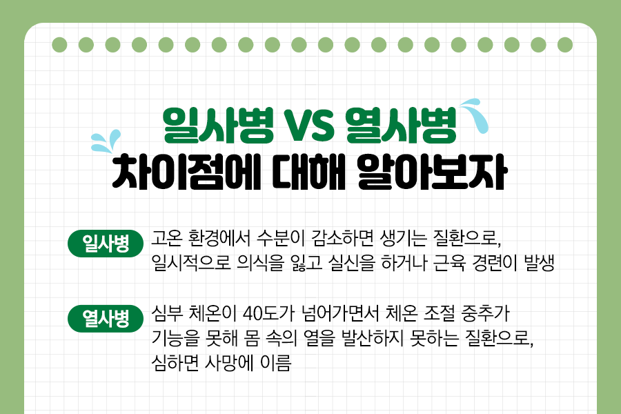 그럼 온열질환이라 불리는 일사병과 열사병의 차이는 무엇일까요? 먼저 일사병에 대해 설명해 드리자면, 일사병은 땀을 많이 흘리고 두통, 구토 등의 증상이 나타나는 질환입니다. 고온 환경에서 수분 보충이 원활하지 않아, 수분이 감소하면 생기는 질환인데요. 신체 온도가 37~40도까지 올라가며, 일시적으로 의식을 잃고 실신을 하거나 근육 경련이 발생하기도 합니다. 일사병에 걸렸을 시 시원한 곳에서 휴식을 취해야 하며, 옷이나 불필요한 장비는 제거해야 합니다. 의식이 명료하고 구토 증상이 없다면 물이나 전해질 음료를 마시는 것이 좋고, 대부분 증상은 즉시 회복되는 편이지만 증상이 지속되거나 탈수가 심하면 정맥 주사를 통한 수액 보충이 필요하므로 병원 치료가 필요합니다.